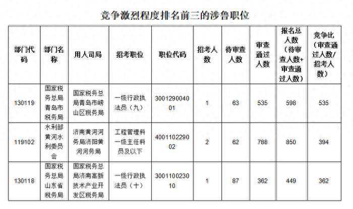 这3个岗位报名人数较多的原因主要在于限制条件相对比较宽松,工作地点分布经济发展相对较好的济南、青岛市,本科学历即可报考,对政治面貌、基层工作经验以及服务基层项目工作经历都无限制,在面试阶段也没有专业能力测试的限制。另外,这3个岗位没有应届生身份限制,整体条件设置宽松,符合条件的考生较多,导致很多考生集中报考。