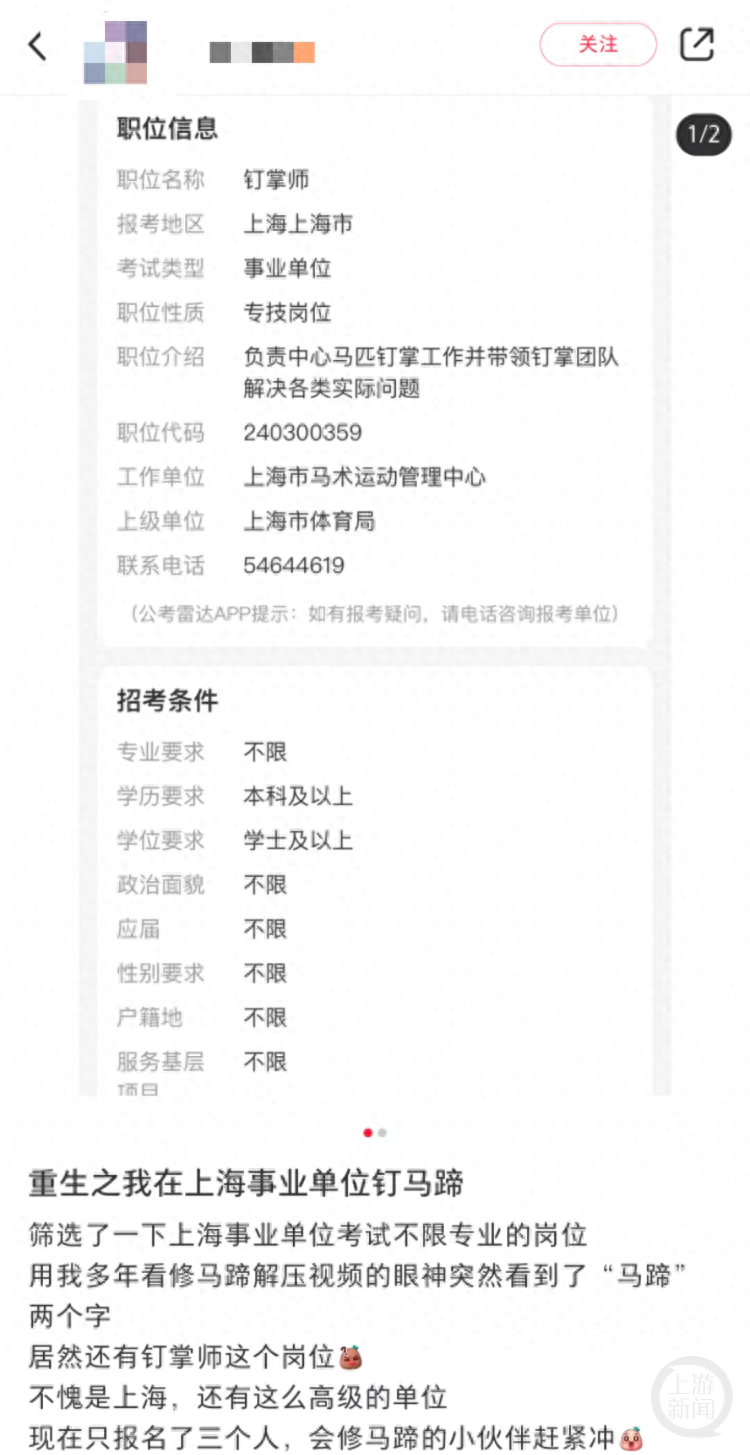 上游新闻记者也在2024年上海市体育局直属事业单位公开招聘中看到了这一信息,报名时间从1月29日至2月2日。5日,上海马术运动管理中心工作人员告诉记者,目前报名已经结束,“中心在职的(钉掌师)也有,但是目前还是很缺人,所以要招聘。”