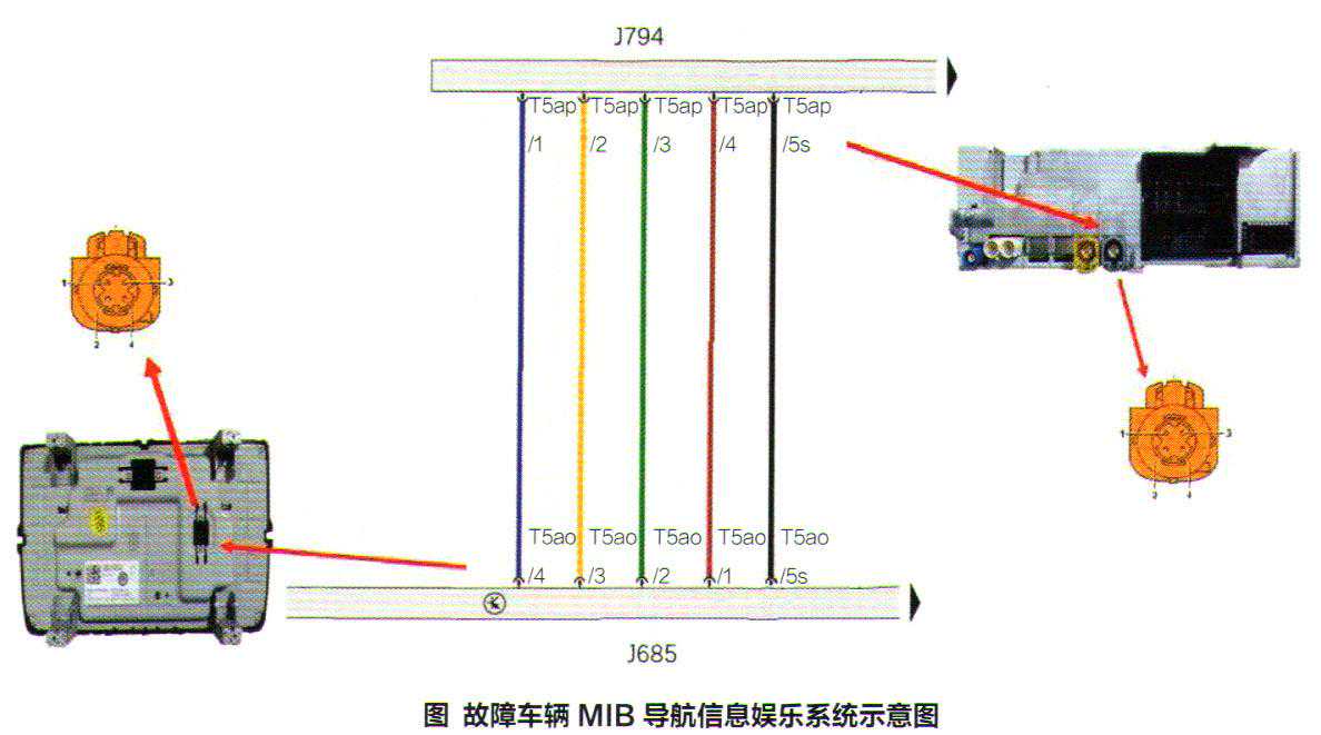 通过查看资料得知,故障车配备的是大众MIB导航信息娱乐系统,由安装在中控台的操作显示单元J685和位于前排乘客侧杂物舱内的导航信息控制单元J794两部分组成。着2个电子部件通过CAN总线和LVDS导线相互连接(图1)。