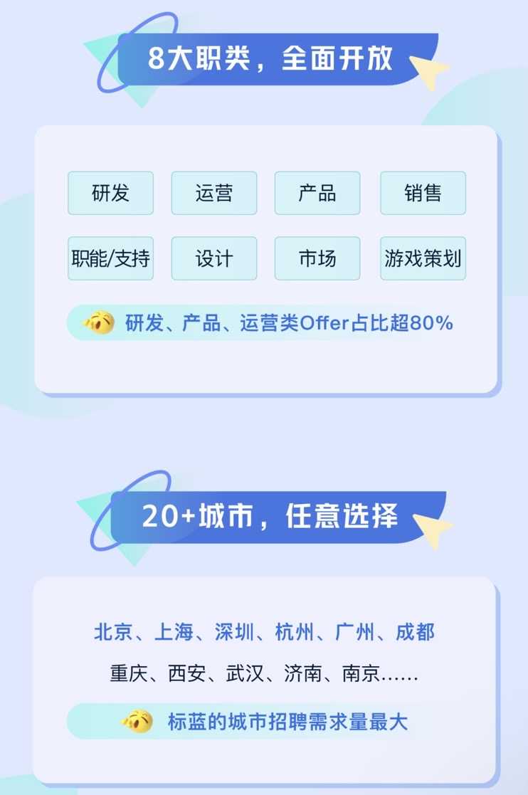 今年字节跳动开放3000+岗位,较去年8000+岗位缩编60%以上。今年校招投递通道将持续开放至10月31日16:00。此次秋招面向2022年9月-2023年8月期间毕业的大学生,开放研发、运营、产品、职能、销售、设计、市场、游戏策划共8种职位类别。值得注意的是,本次招聘中,研发、产品、运营类岗位占比超过80%。