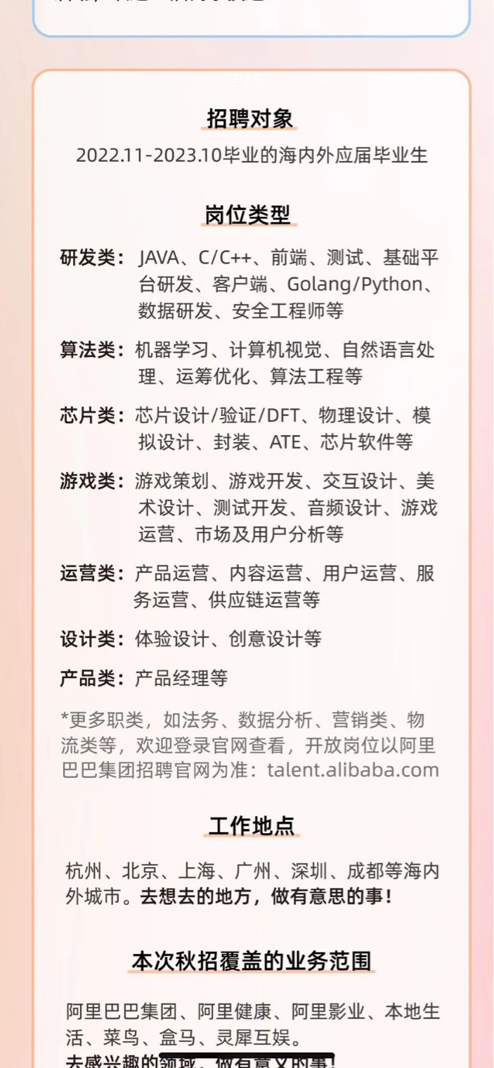 阿里目前已开启2023届秋招流程,面向2022年11月-2023年10月间毕业的应届,开放研发、算法、芯片、游戏、运营、设计、产品等岗位。据介绍,今年阿里秋招技术类岗位占比超85%,可见技术类目前仍是大厂们的主要招募对象。