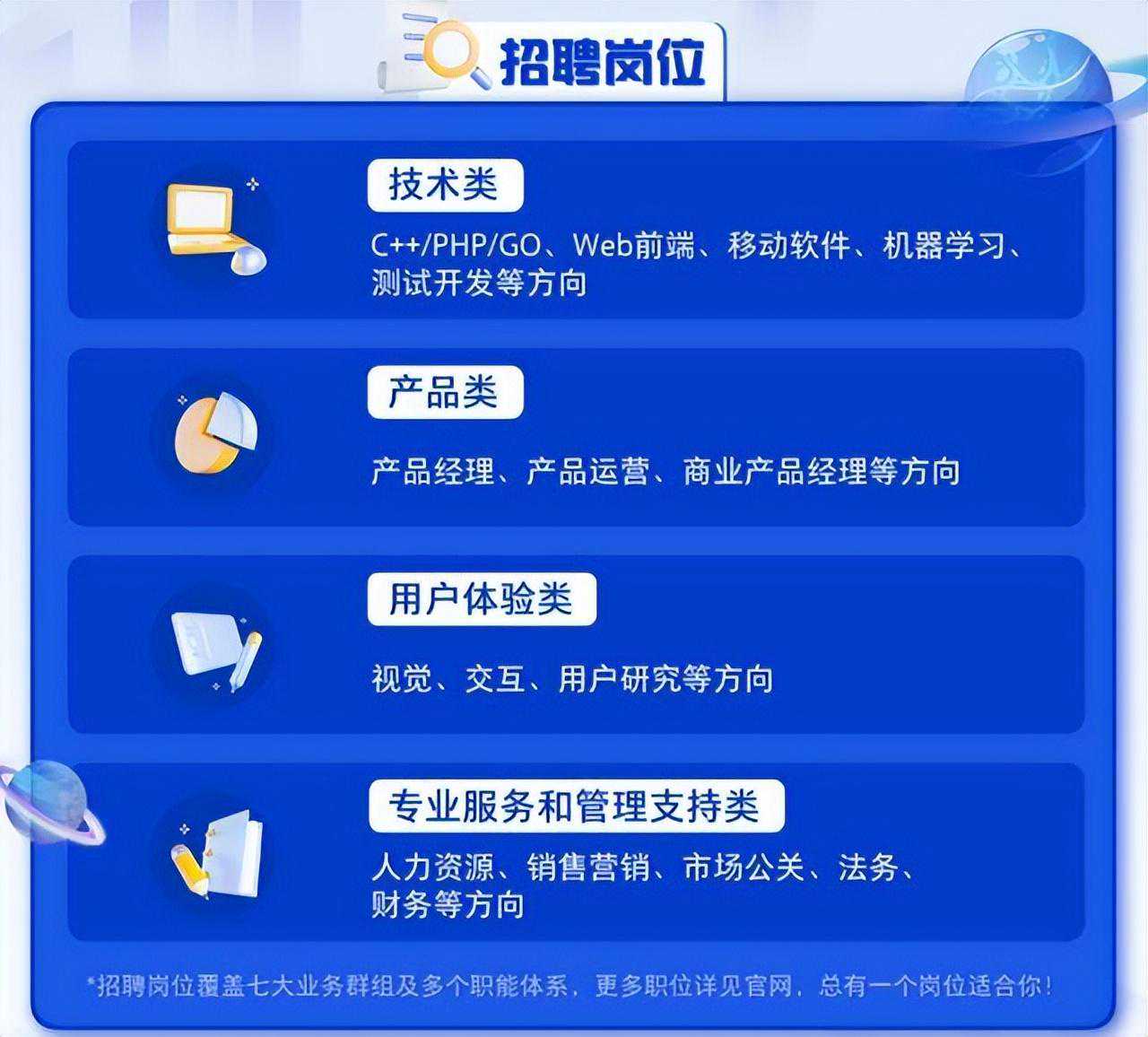 百度此次23届秋招面向2022年9月1日-2023年8月31日期间毕业的国内外高校毕业生,开放包括技术类、产品类、用户体验类、专业服务和管理支持类四大类、140+细分岗位。