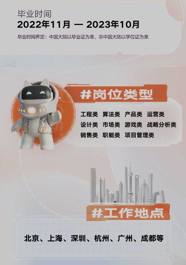 快手23届校招面向2022年11月-2023年10月的毕业生,开放11类200余种岗位。