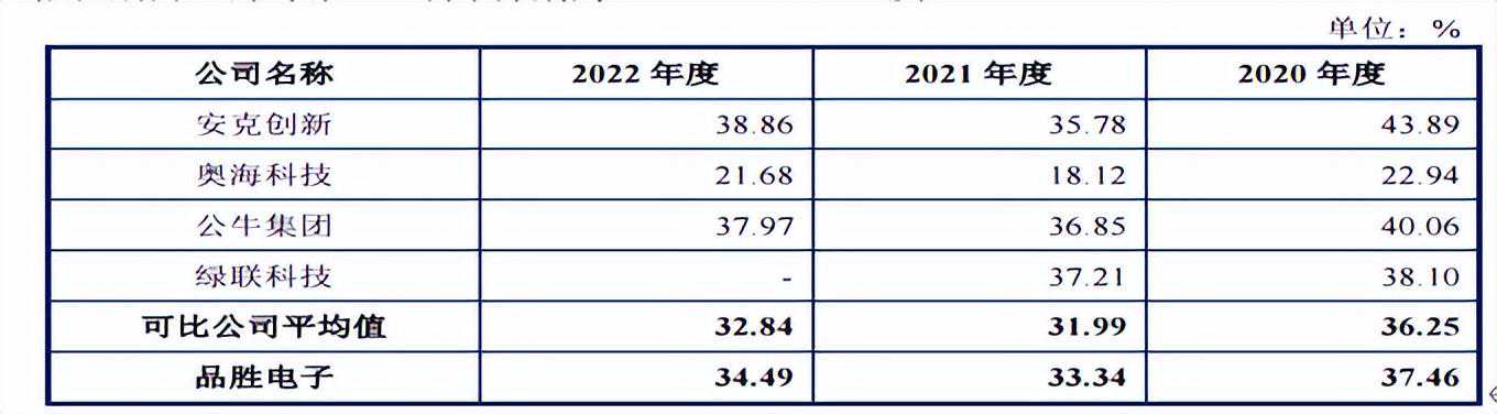 报告期内,公司综合毛利率分别为37.30%、33.22%及34.47%。公司所处行业内主要企业包括公牛集团、安克创新、绿联科技、奥海科技及倍思科技等。