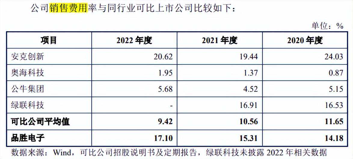 公司围绕消费电子市场,搭建了完善的线上、线下销售渠道,形成了面向零售客户的经销、直销模式和面向企业客户的ODM/OEM业务模式。报告期内,品胜电子销售费用金额分别为1.62亿元、2.033亿元和2.272亿元,占各期营业收入的比重分别为14.18%、15.31%和17.10%。与可比同行均值11.65%、10.56%和9.42相比,公司的销售费用率要远超同行。