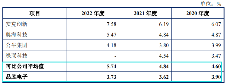 报告期内,品胜电子研发费用金额分别为4,451.57万元、4,803.63万元和4,957.27万元,占各期营业收入的比重分别为3.90%、3.62%和3.73%,低于可比同行研发费用率均值4.60%、4.84%和5.74%。