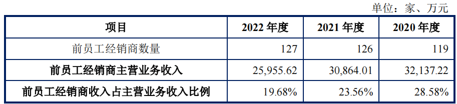 报告期内,公司前员工经销商数量分别119家、126家和127家,前员工经销商收入分别为3.214亿元、3.086亿元和2.596亿元,占当期主营业务收入的比例分别为28.58%、23.56%和19.68%,呈现逐年下降的趋势。