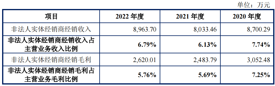 报告期内,公司非法人实体经销商经销收入占当期主营业务收入的比例为7.74%、6.13%及6.79%,占比较低。