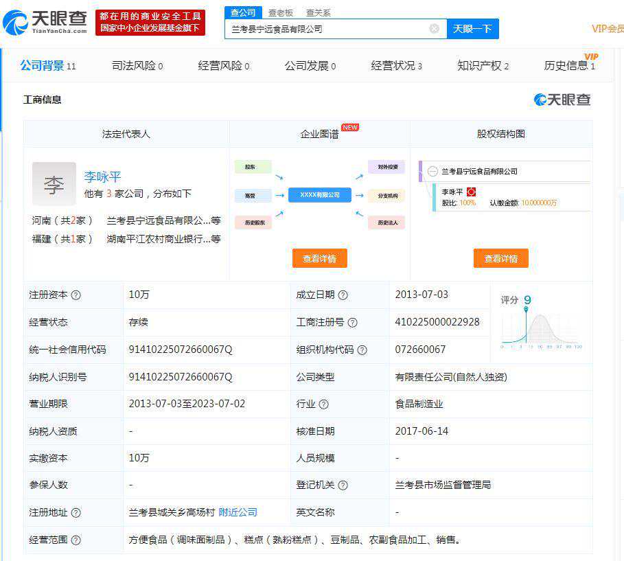 天眼查信息显示,央视315曝光的辣条事件中,“李师傅虾扯蛋辣条”主体公司为兰考县宁远食品有限公司,法定代表人李咏平,注册于2013年。