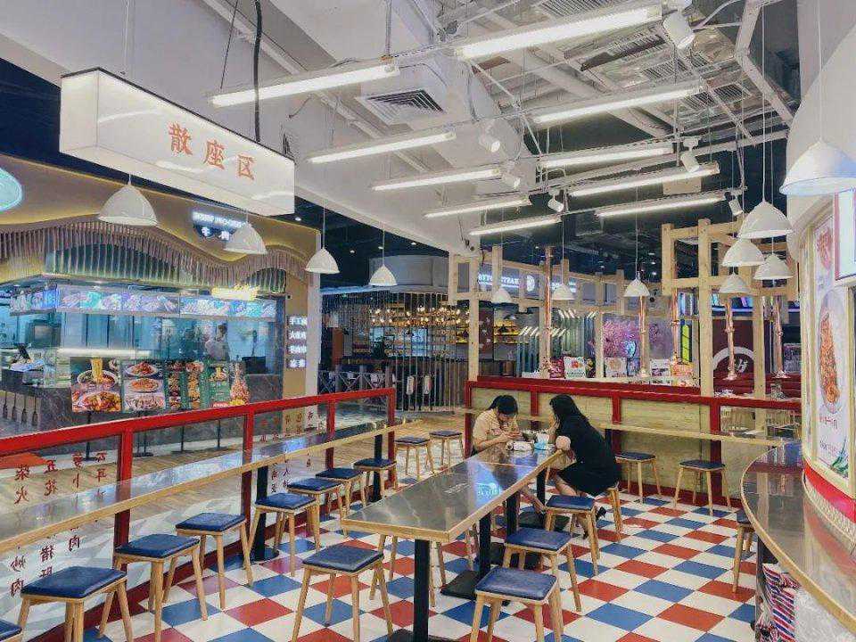 『霸碗盖码饭』是以红⽩蓝三种颜⾊为主,“江湖⻛”和“⼩清新”的装修⻛格,颠覆⼈们对盖码饭烟⽕⽓太重的旧知。