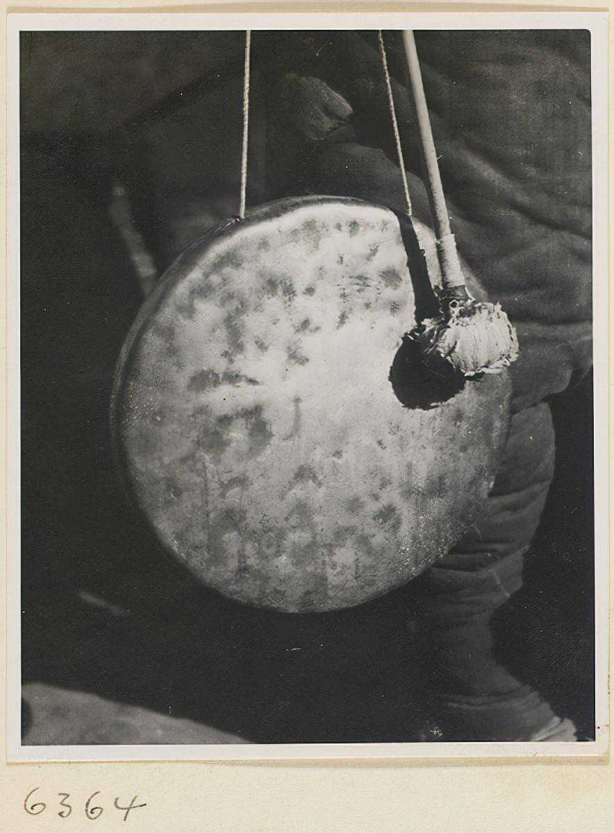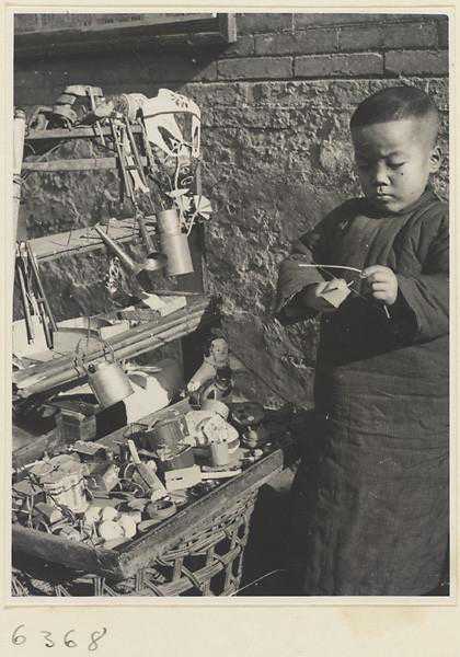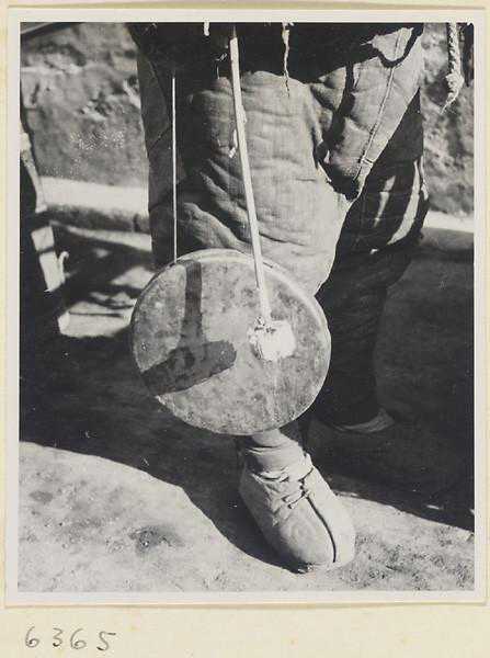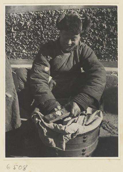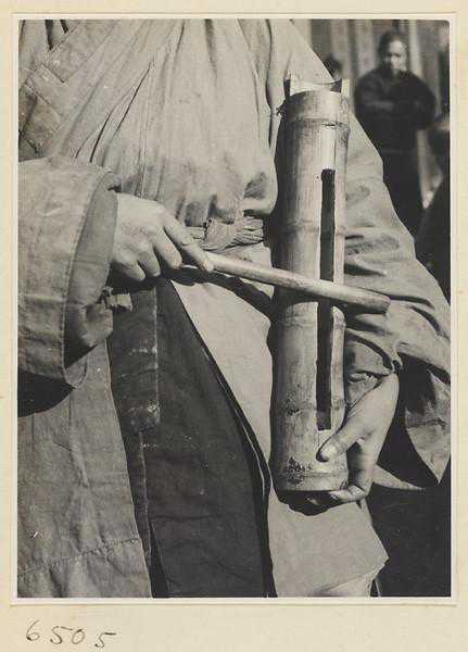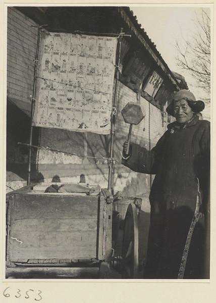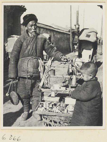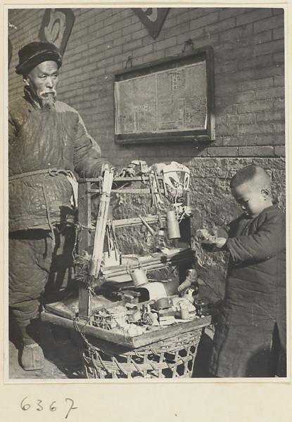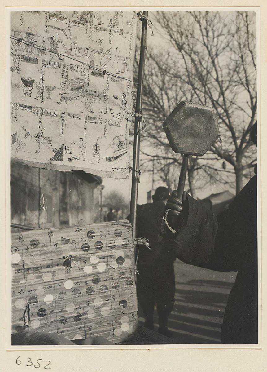 卖玩具小贩敲着一个铜锣招揽顾客