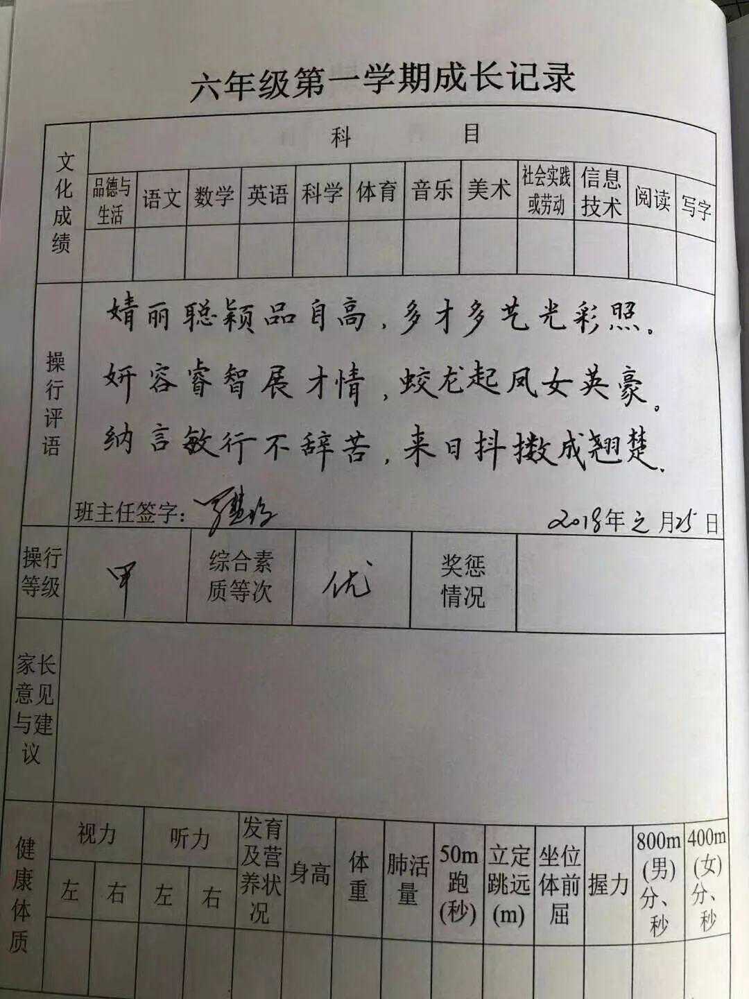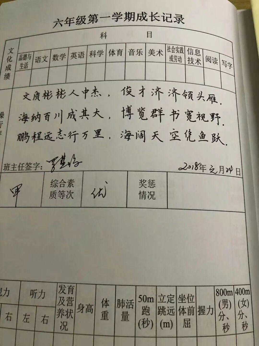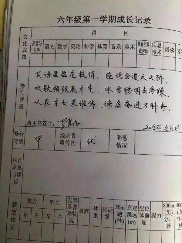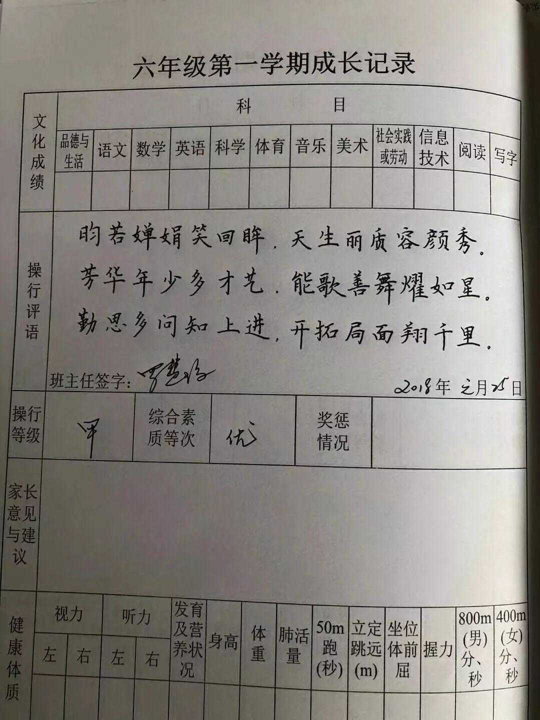 近日,赣州于都县天润学校六年级教师罗慧琼老师用端正秀气的硬笔书法书写,将操行评语浓缩为精炼的七言诗句,并且诗句里还植入了孩子的名字。