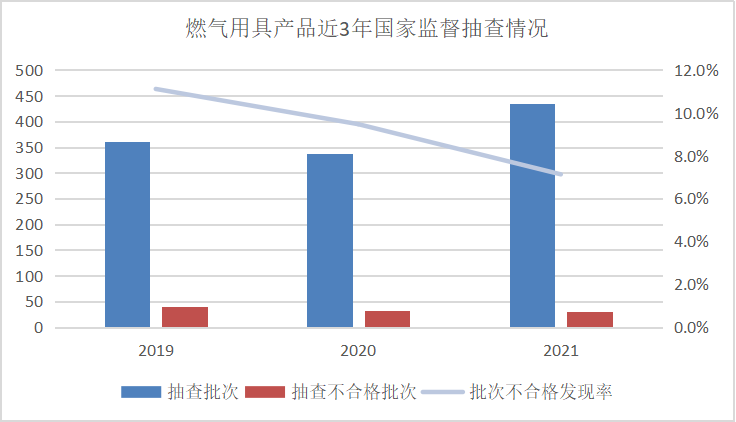 (一)家用燃气用具抽查结果分析。本次抽查共对431家企业生产的435批次家用燃气用具产品进行了检验,发现31批次产品不合格,不合格发现率为7.1%。该类产品近三年整体不合格发现率为11.1%、9.5%、7.1%。该类产品中,燃气采暖热水炉不合格发现率最低,为1.4%。