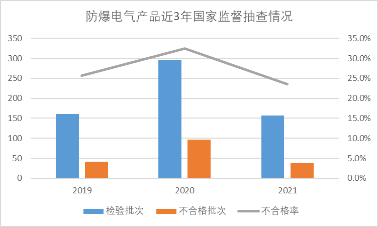 (二)防爆电气产品抽查结果分析。本次抽查了158家企业生产的159批次防爆电气产品,检验157批次,发现37批次产品不合格,不合格发现率为23.6%,其中防爆灯具和防爆电机的不合格发现率均超过25%。该类产品自2019年至2021年,整体不合格发现率为25.6%、32.4%、23.6%。