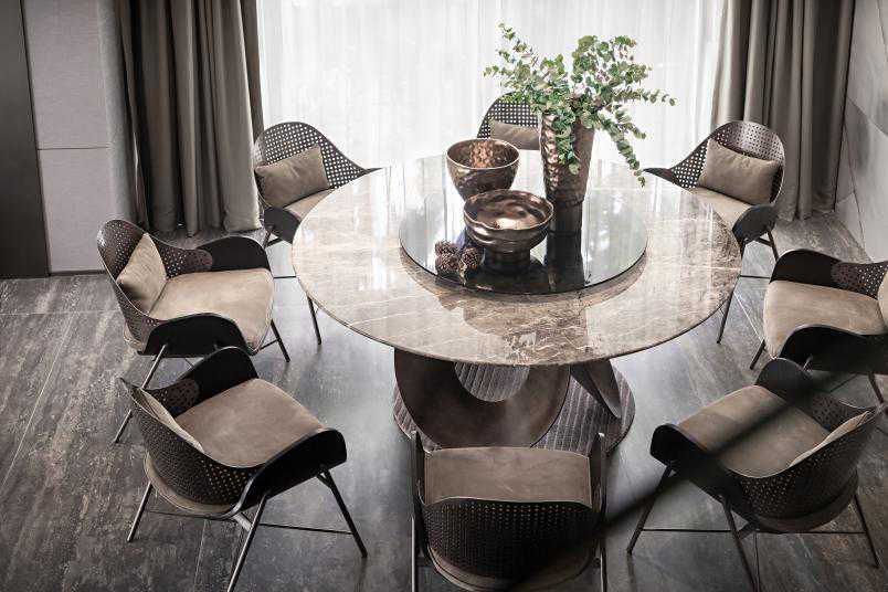 餐厅与客厅开敞联合,有效拓展了公共区域的活动范围与分区层次,最大化挖掘相邻场域的渗透与交互,大理石背景亦成为空间共同语汇,回应了现代人返朴归真的诉求。以个性铜材餐桌与摆设营造气息轻爽的用餐环境,边用餐,边感受艺术之美,感悟生活之味。