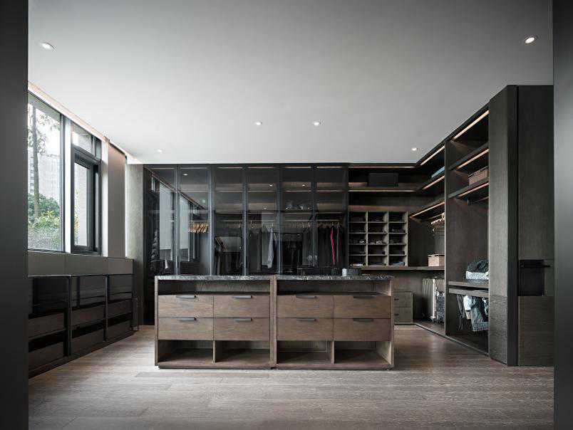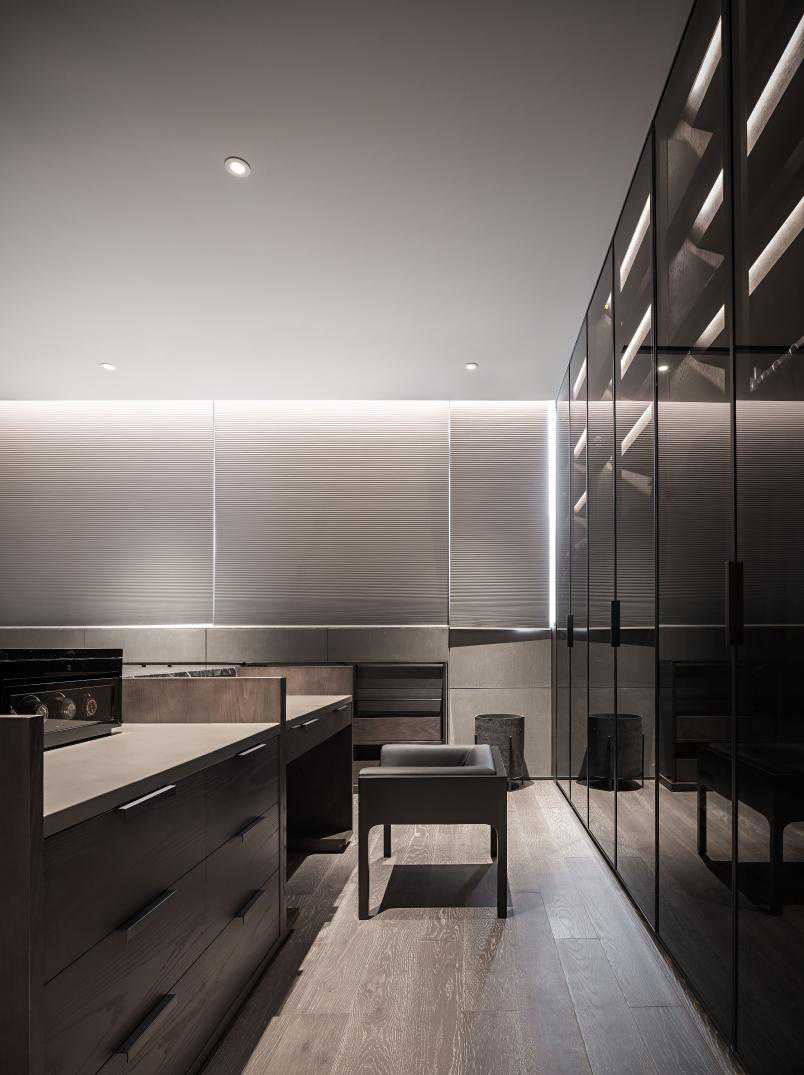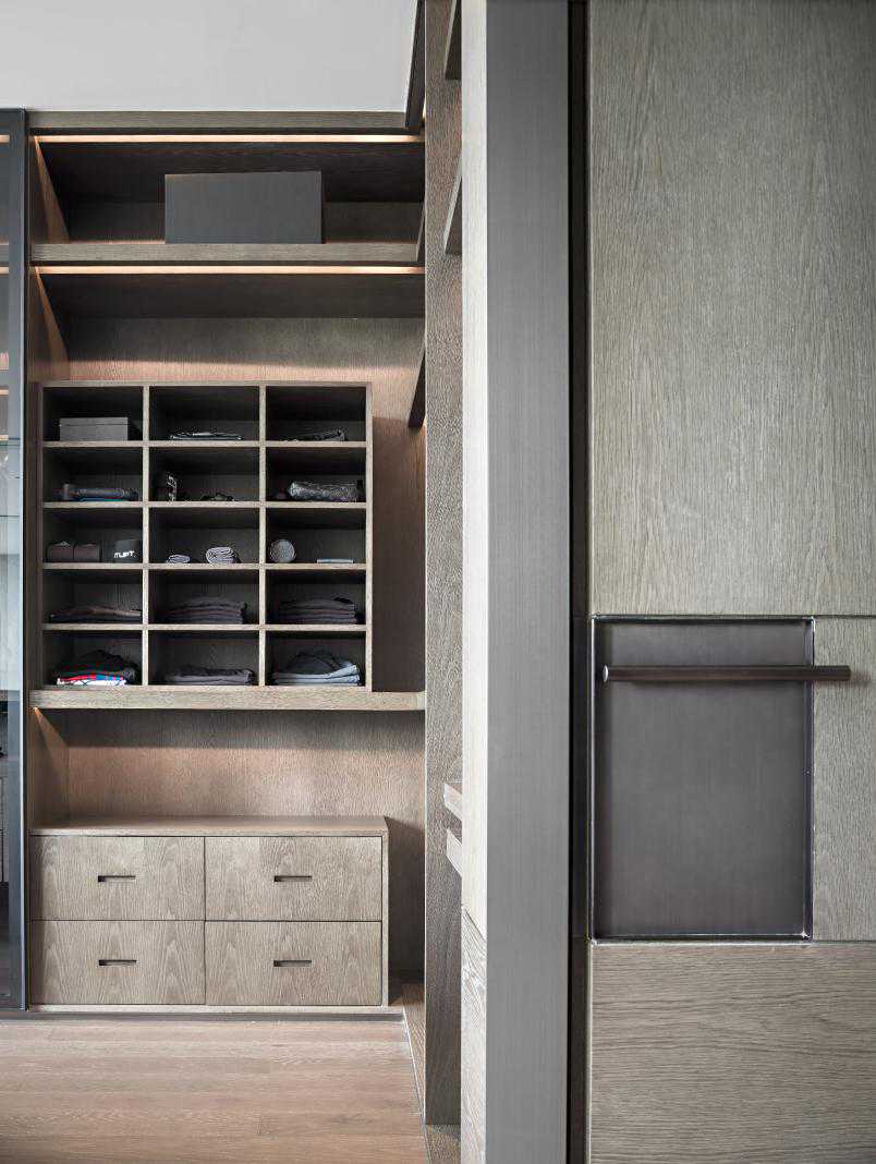 衣帽间环视所见,硬朗与柔软、温润与质感、点与线、大与小交融共舞。这皆是设计师精准拿捏室内尺寸、收纳比例、构图审美及细节重视的最佳证明。