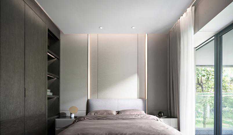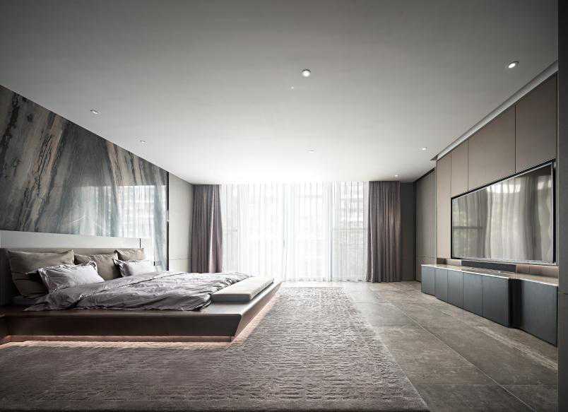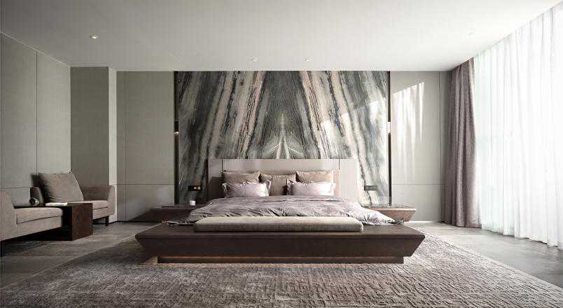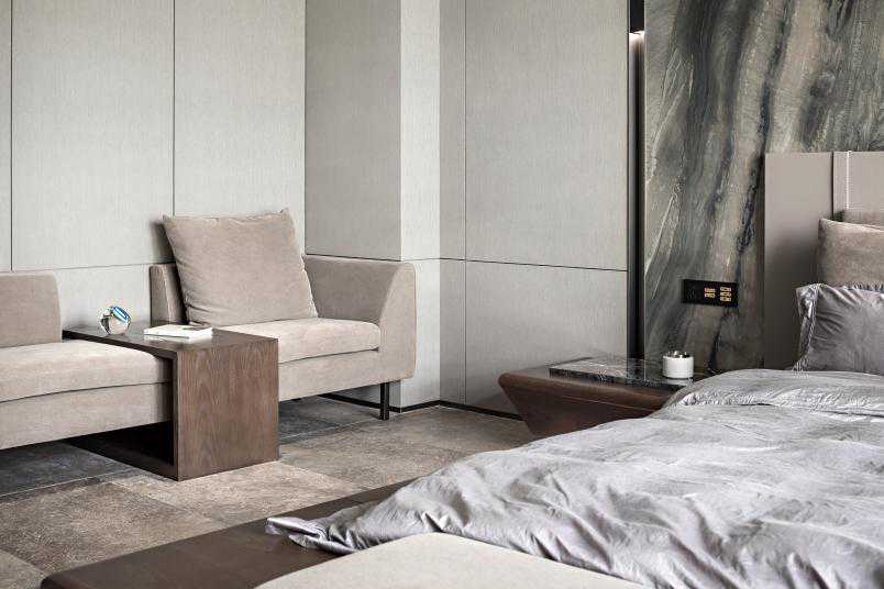 进入主卧,大理石背景墙和客厅餐厅背景墙设计如出一辙,作以造型延伸。莫兰迪色与诸多质感层次的碰撞与交融,增加一种高级和舒适的氛围感,设计师将对家的理解温暖地投注进去。