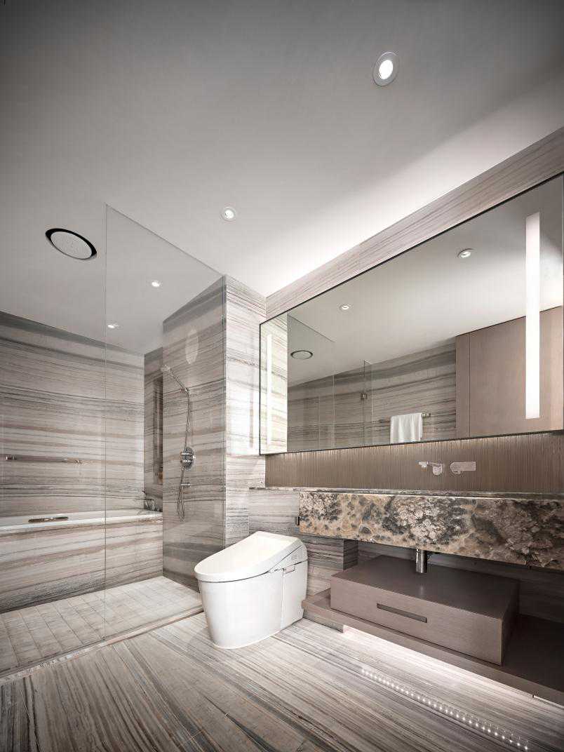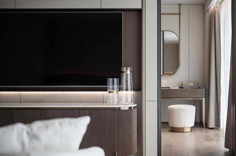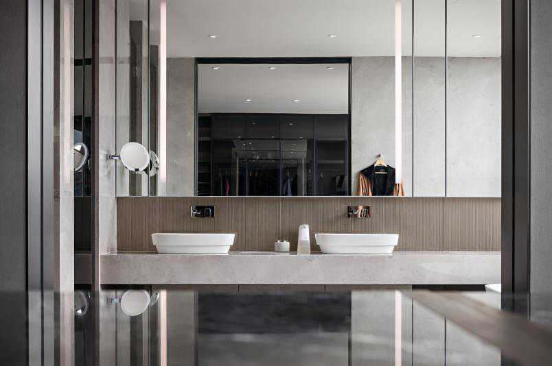 卧室和卫生间通过条纹地毯与大理石纹理进行象征性的贯穿,产生流动感,高级气质中更加彰显轻松写意。