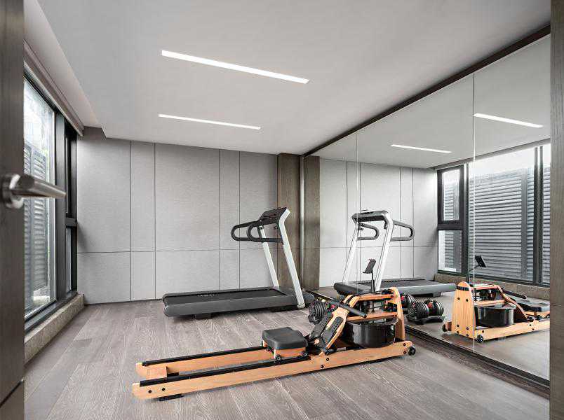 健身房空间通过整体延续的方式,莫兰迪色调及木地板材质再次相互渗透、融会贯通。