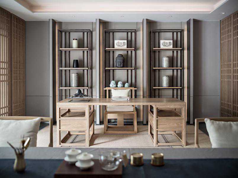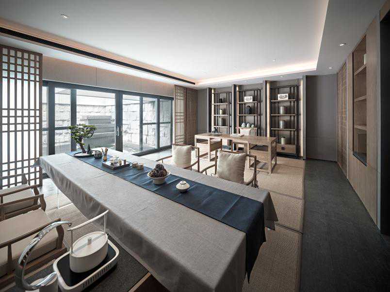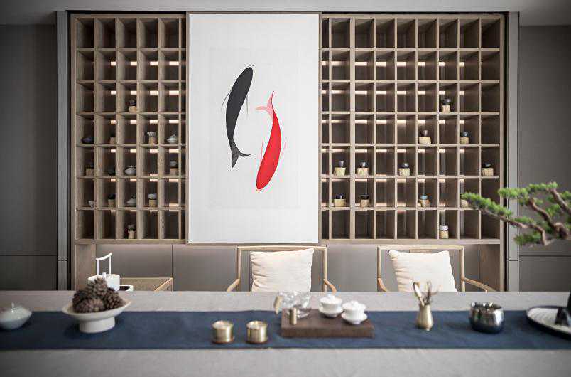 茶室整体色系上采用了温润的茶汤色,设计元素的呼应与融合在此运用娴熟。中式家具及茶台都极具体块与线条韵律,画作简约的笔触勾勒艺术感知,纳万象于方寸之中。自然而然将人的视线引向上方。