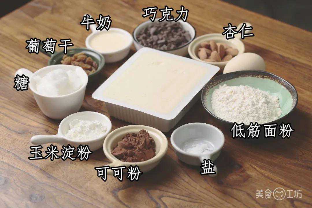 方子里的食材除了主要的豆腐、低粉、淀粉不能更换,其他的食材都是可以随意替换的。美食君用到的是杏仁,但想着核桃应该也不错~如果买不到烘焙用的巧克力豆,普通的巧克力也可以。