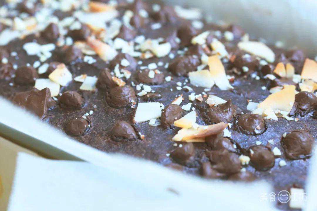 5.在烤盘中垫硅油纸,将面糊装盘,表面撒上巧克力豆、椰子脆皮。(没有可不撒)烤箱预热至180℃,放入中层,上下火烤35~40分钟即可。