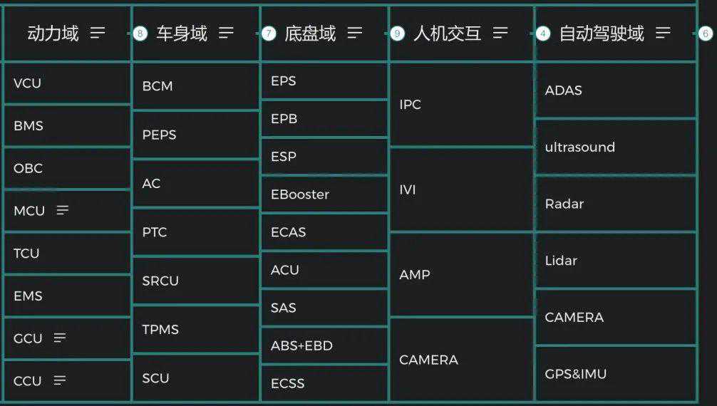 不同的功能域中,通常包含哪些ECU?在电子架构的发展中,有新的ECU出现,也有老的ECU消失。更有同一个ECU有可能被分布在不同的域中。