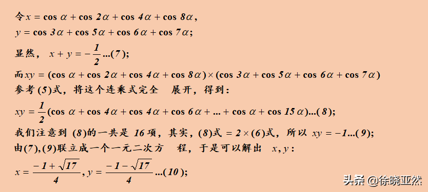 这里的(13)式又是一个一元二次方程的根与系数的关系式,于是我们联立前面的(12)式,就可以解出cosα。这里最终的结果是: