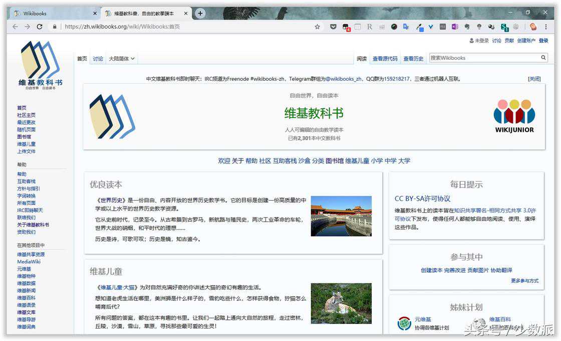 Wikibooks维基教科书项目隶属于维基媒体基金会旗下,网站主要收集教科书或者用户自己编辑的书籍,提倡分析人人可编辑的自由教学读本,目前已经收录超过3000本共80000多页的电子书。