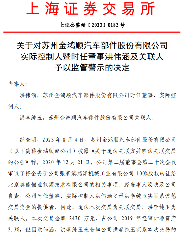 因此,上交所作出如下监管措施决定:对苏州金鸿顺汽车部件股份有限公司时任董事、实际控制人洪伟涵,关联人洪李纯玉予以监管警示。