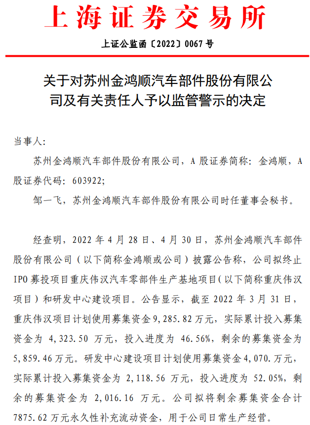 经上交所审查,根据金鸿顺公告内容,终止重庆伟汉汽车零部件生产基地项目、研发中心建设项目的原因在2020年即已出现,并且已延续长达两年。在项目可行性出现重大变化的情况下,公司均未在每半年出具的《募集资金存放与使用情况专项报告》中对可行性发生变化作出风险提示。直至2022年4月份,公司才对外披露项目终止公告,相关信息披露不及时。鉴于上述违规事实和情节,上交所对金鸿顺和时任董秘邹一飞予以监管警示。