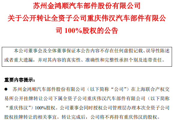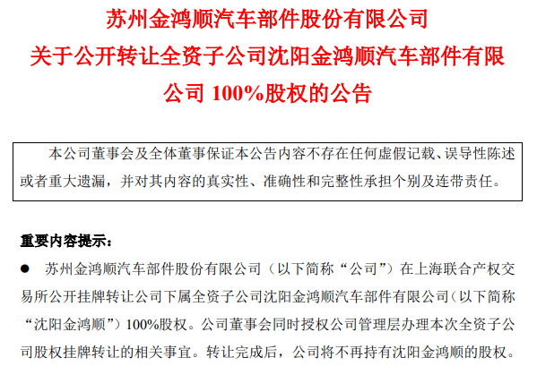 今年7月11日,金鸿顺公告,为了盘活公司存量资产,公司拟在上海联合产权交易所公开挂牌转让下属全资子公司重庆伟汉汽车部件有限公司100%股权,挂牌价不低于5350.62万元;挂牌转让下属全资子公司沈阳金鸿顺汽车部件有限公司100%股权,挂牌价不低于4789.97万元。