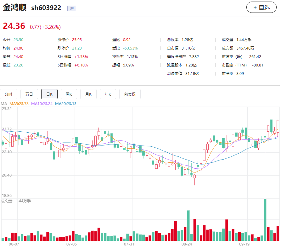二级市场上,金鸿顺的股价去年底从高位大幅下跌,今年以来股价呈现震荡走势,截至2023年10月10日收盘,公司股价为24.36元/股,市值为31.18亿元。为提振股价,金鸿顺近日发布公告,公司拟以自有资金以集中竞价交易方式回购公司已发行的部分人民币普通股(A股)股票,在未来适宜时机用于员工持股计划及/或股权激励计划,拟回购的资金总额不低于人民币1000万元(含),不超过人民币1500万元(含),回购价格不超过人民币30.00元/股。
