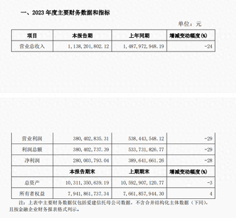 公告显示,2023年,爱建信托全年实现营业总收入11.38亿元,较上年同期减少3.50亿元,降幅24%,实现利润总额3.80亿元,较上年同期减少1.53亿元,降幅29%。全年实现净利润2.80亿元,较上年减少1.10亿元,降幅28%。