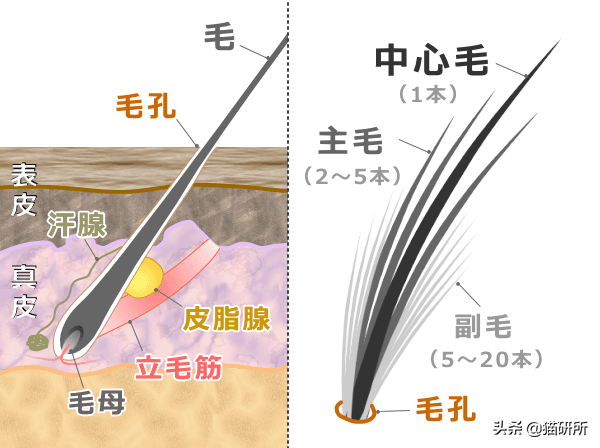 这是因为猫咪皮肤下的毛囊聚集在一起,形成了复合毛囊。复合毛囊通常由一个主毛囊和N个副毛囊构成。主毛囊长出长而粗的主毛,就是我们通常说的护毛。