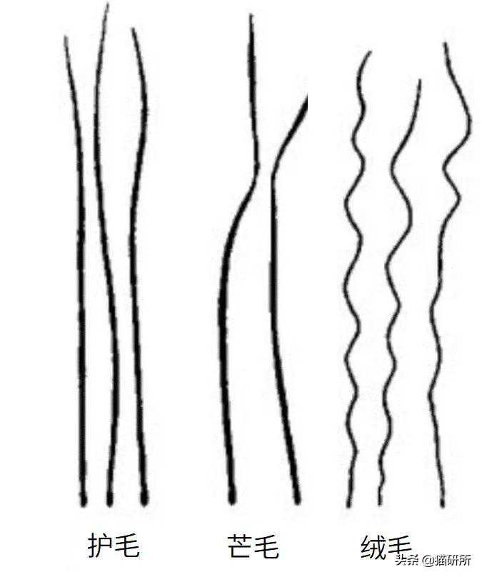 副毛囊长出会长出两种不同形态的猫毛,形态为粗-细-粗的被称为芒毛、比较卷曲的被称为绒毛。