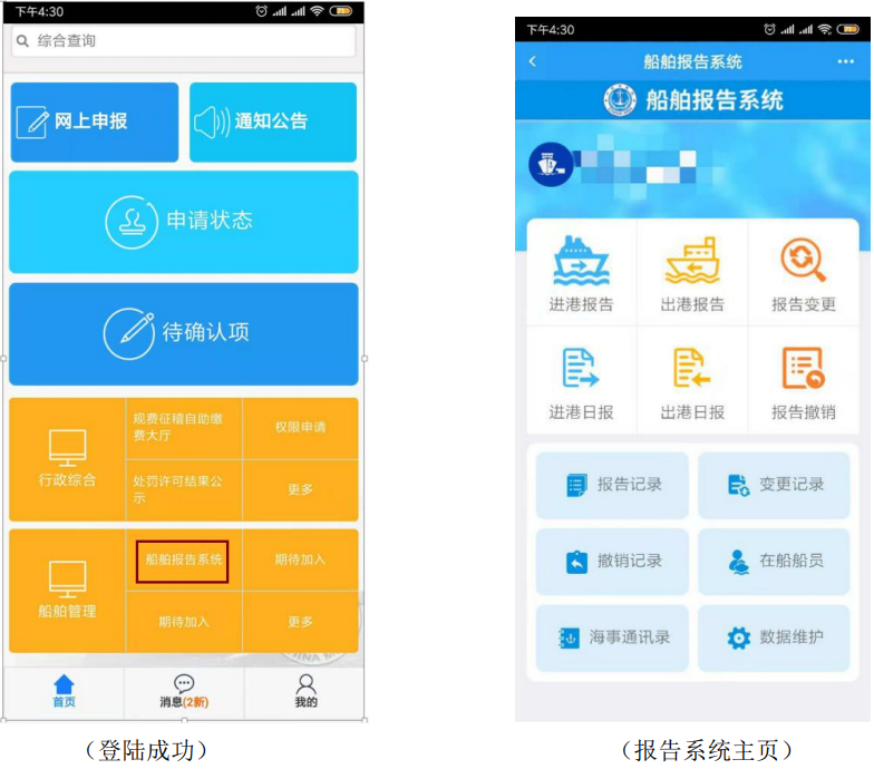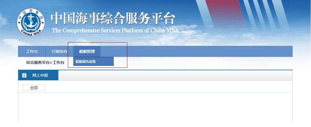 方式二:在办理船舶进出港报告时,登录中国海事综合服务平台手机客户端(可通过中国海事综合服务平台网站),选择船舶报告系统,跳转至船舶报告系统主页。