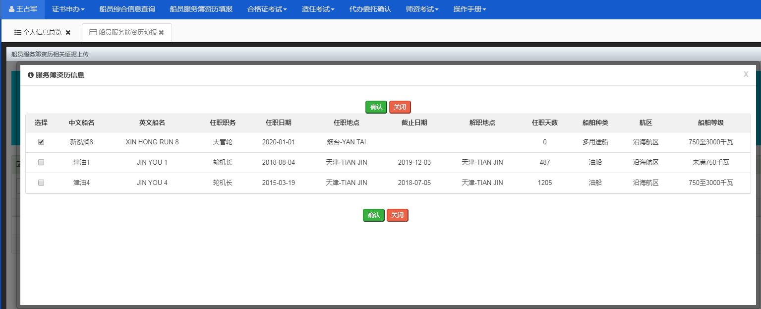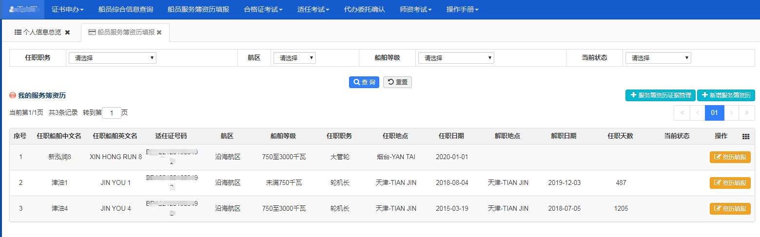 路径:船员电子申报系统-船员服务簿资历填报。
