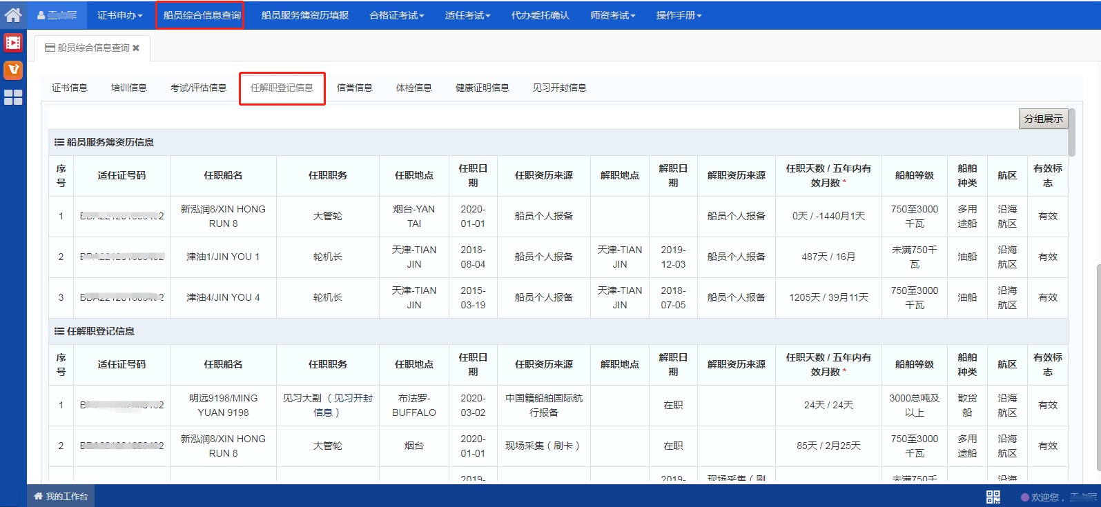 “船员服务簿资历信息”为船员本人填报的服务簿资历,“任解职登记信息”为公司报备、船舶进出港报告、前期现场办理等渠道产生的任解职信息。