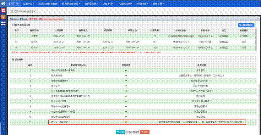 系统中办理海船船员适任证书、培训合格证时提交的资历信息为船员个人账户填报的服务簿资历信息,建议在每次任解职之后及时维护船员服务簿资历信息,如就此委托相关机构代为办理的,请船员及时核对,以便发现问题后进行更改。船员服务簿资历不满足办证条件者不能提交。如下图: