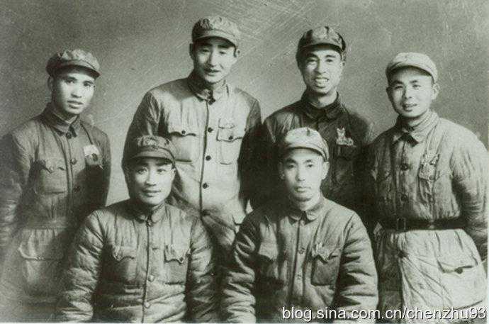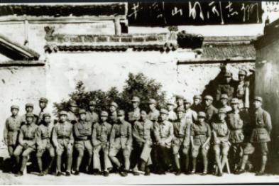 参加井冈山斗争的部分同志1938年在延安的合影。一排左起:梁军、谭冠三、谭政、滕代远、肖克、林彪、毛泽东、高自立、何长工、曾玉、欧阳毅。二排左起:胡友才、孙开楚、谢翰文、江华、朱良才、吴溉之、李寿轩、刘先胜、张际春、李克如、韩伟、龙开富、谭希林、刘型、陈伯钧、张令彬。三排左起:徐日文、曹里怀。