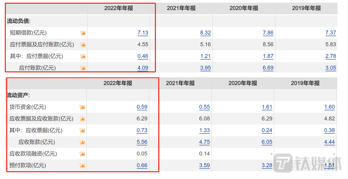 净利润大跌,资金面紧张,欲引国资入股未成功相比于业绩,公司还处于大量短期借款和应付账款压顶的窘境。2022年年报显示,当期末流动资产中应收账款和应收票据合计6.29亿元,而货币资金仅0.59亿元,流动负债中短期借款高达7.13亿元,应付账款和应付票据合计4.55亿元。显然,公司账面资金远无法覆盖短期借款和应付账款,或将面临较大的短期偿债压力。