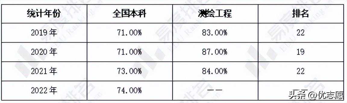 下表为测绘工程专业本科毕业生毕业半年后的工作相关度情况。测绘工程专业本科毕业生毕业半年后的工作相关度高于全国本科工作相关度平均水平。2020届毕业生为2019-2022届毕业生中工作相关度最高的一届。2020年以后,受疫情及房地产市场影响,测绘工程专业毕业生工作相关度逐年下降,2022届跌落榜单。