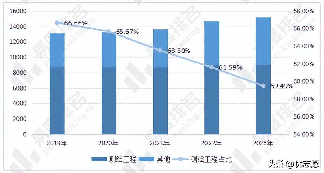 测绘工程专业为测绘类各专业中招生占比最大的专业,每年测绘工程专业招生人数占比超过50%。近几年测绘类计划招生人数持续上升,测绘工程专业的计划招生人数基本保持不变,测绘工程专业招生占比有所下降。