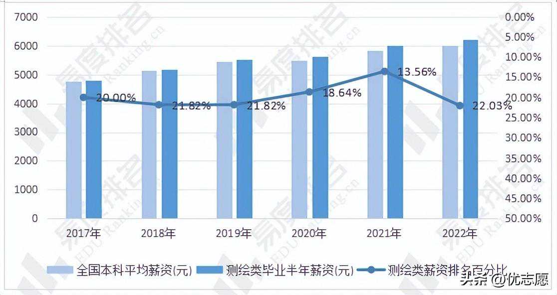 图52017-2022年测绘类本科生毕业半年的月薪资及排名百分比