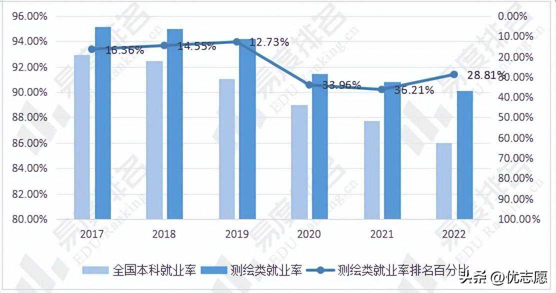 三、测绘类就业率远高于全国本科就业率下图为2017-2022届测绘类本科毕业生毕业半年后的就业情况,毕业半年后的就业情况可以理解为测绘类应届毕业生的就业情况。受大环境影响,测绘类应届毕业生就业率逐年降低但依然高于全国本科就业率平均水平。测绘类的就业率一直在90%以上。受疫情影响,疫情之后的就业率排名不如疫情之前,2022年测绘类应届毕业生的就业率排名出现好转,就业率排名百分比较2021年上涨7.4个百分点。