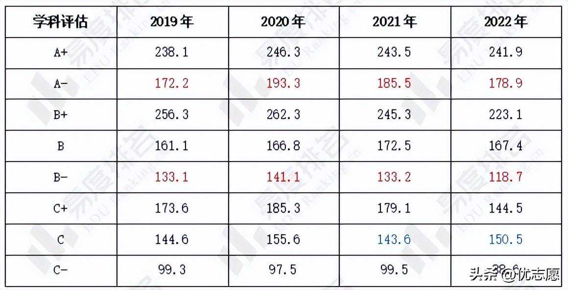 表1测绘类专业按学科评估分类2019-2022年线上分差(各省平均)