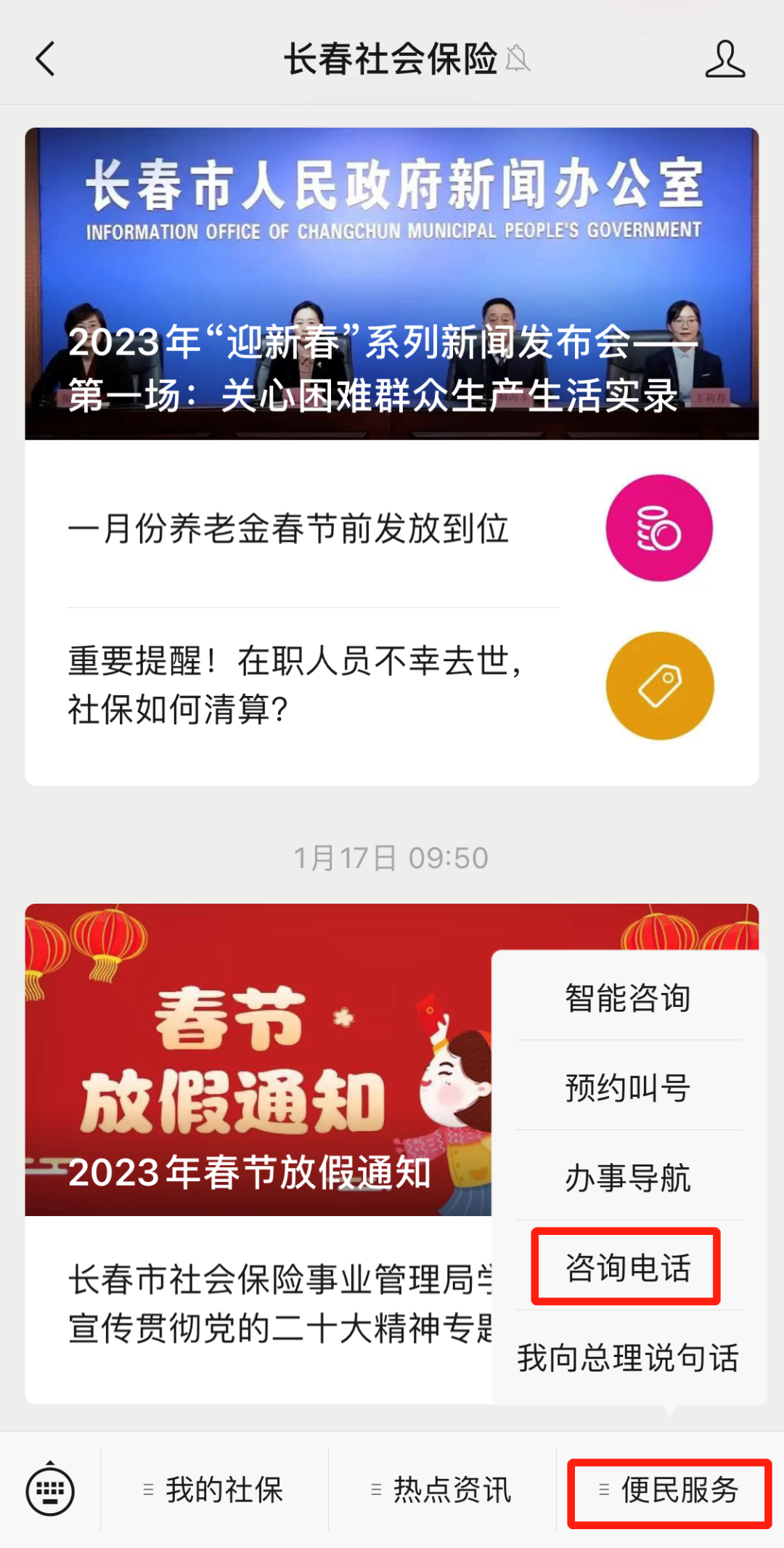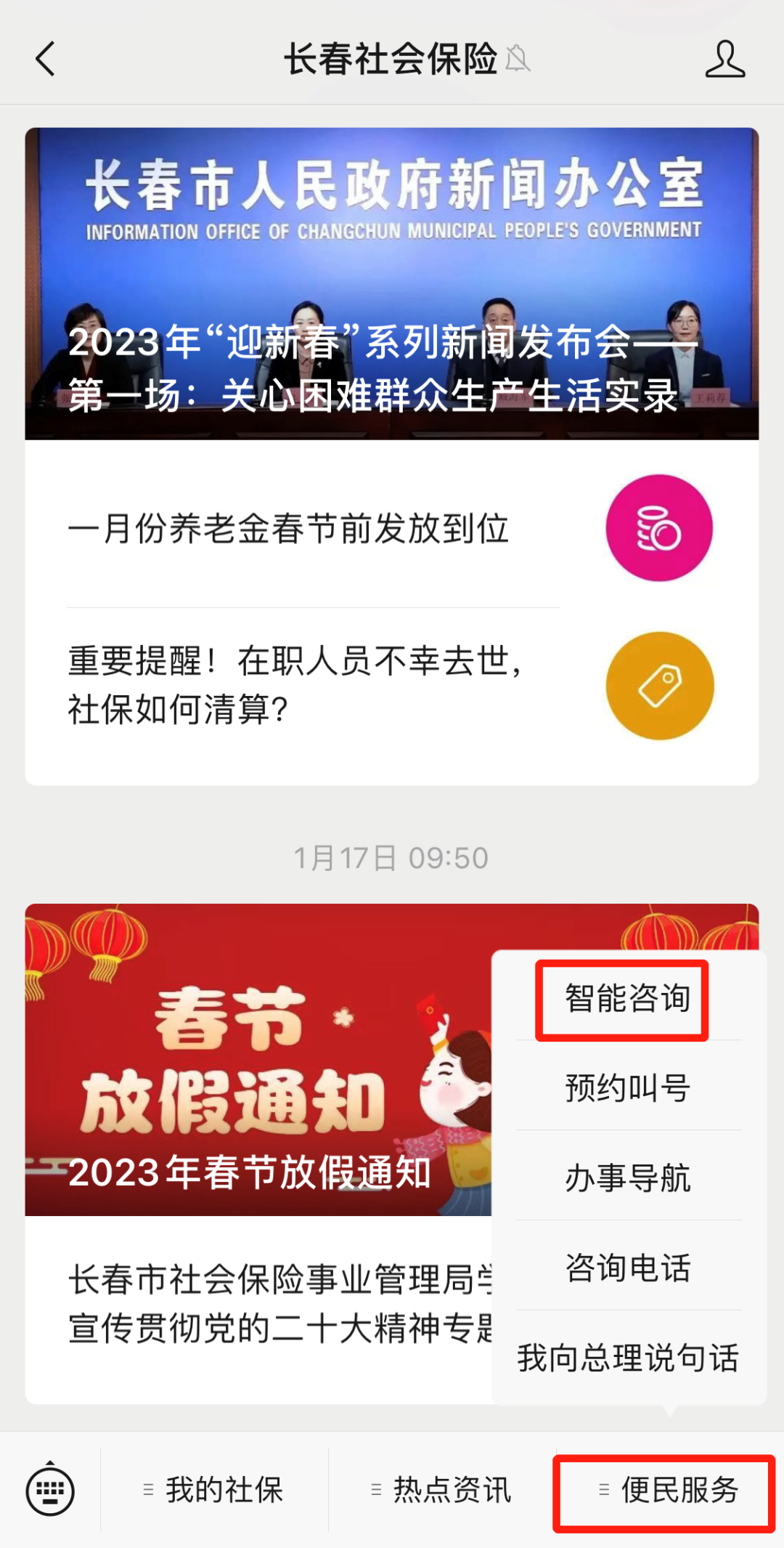 应用“长春社会保险”微信公众号右下角“便民服务”栏目中“智能咨询”服务。