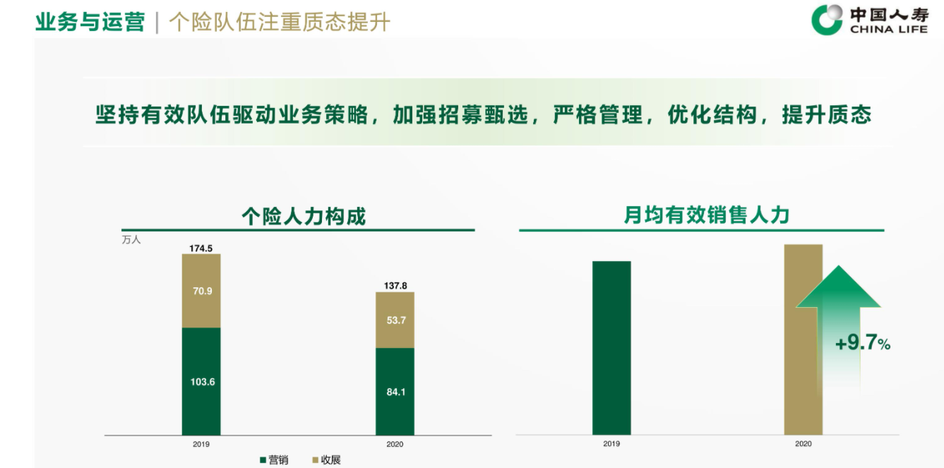 在人力规模方面,个险队伍实现逆市而上,行业第一且量质并生,2020年销售人力达到137.8万人,期中2020年收展队伍规模超过50万人,且成为个险新的增长点,诸多核心指标表现靓丽。