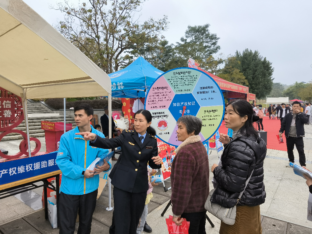 食美味品美酒,选年货迎新春。当日,绵绵冬雨挡不住群众的逛展热情。活动现场,产品展上火龙果干、竹笋、米酒、蚕丝被等云安“土特产”悉数亮相,前来现场品尝、购买云安各类特色产品的群众络绎不绝,不少群众满载而归。现场还布置了有奖问答活动区,让社区群众以游园方式了解知识产权知识。